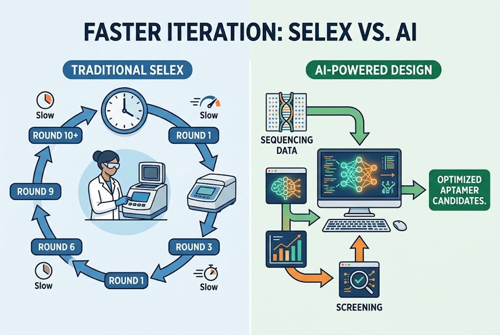 Instead of relying solely on physical enrichment, AI algorithms—such as Recurrent Neural Networks (RNNs), Transformers, and Graph Neural Networks (GNNs)—analyze the sequencing data from just the first few rounds of a SELEX experiment. The AI learns the underlying sequence-to-function and sequence-to-structure relationships. It can then predict the binding affinities of sequences that were never even physically synthesized, effectively expanding the search space exponentially and generating de novo sequences with optimized properties.